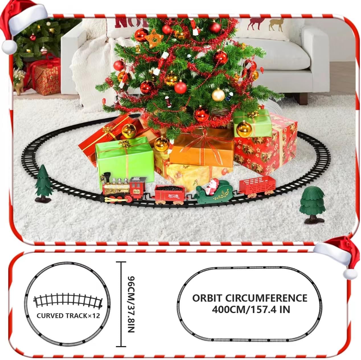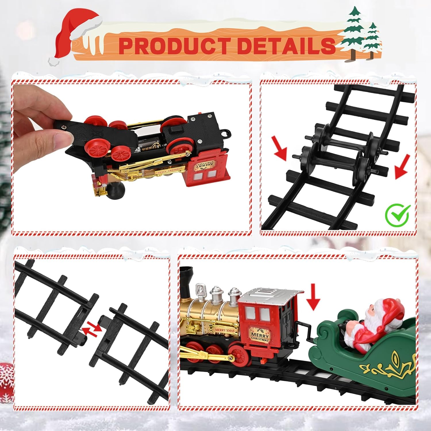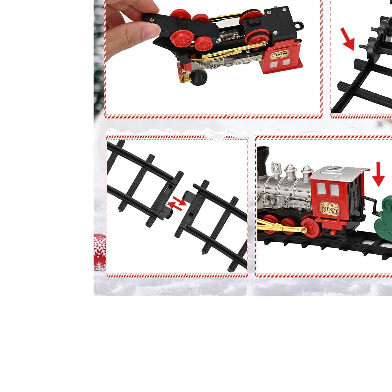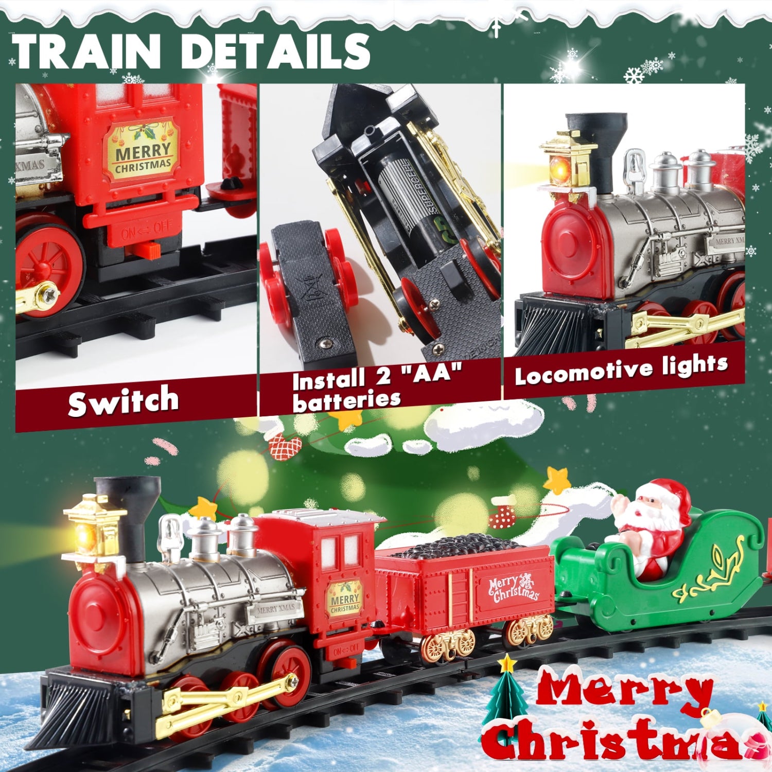 El tren de Navidad incluye un tren clásico compuesto por una locomotora, vagones de Papa,Noel vagones de mercancías, vagones de carbón, cuatro vías rectas, doce vías curvas y adornos decorativos. La locomotora funciona con 2 pilas AA de 1,5 V (no incluidas).